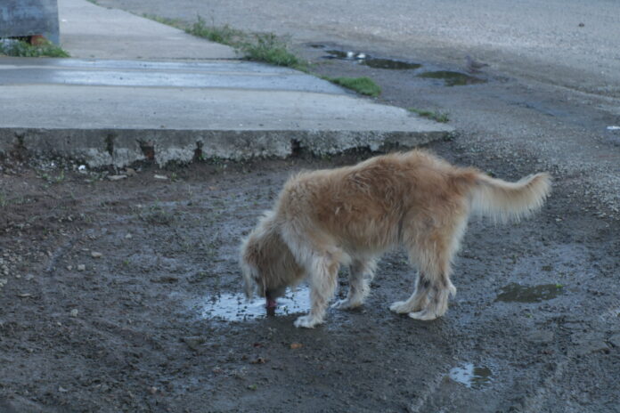 Cachorro bebendo água de poça de chuva. Foto: Isabelle Hoffmann