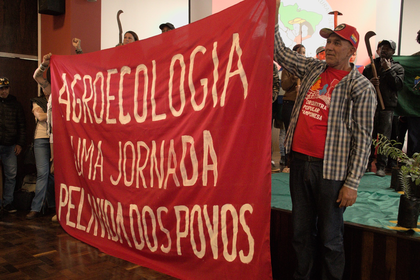 Ato político durante a conferência com trabalhadores do campo exibindo bandeira com o texto: “agroecologia uma jornada pela vida dos povos” (Foto: Vitória Smarci).